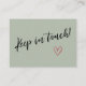 Keep your friends and family up to date with your new address using these simple, elegant enclosure cards. You can insert them into your mailings or share them in person, as you run into people you need to notify. When you want a distinctive method for letting your tribe know how to find you, this card is versatile enough for anyone. It features pretty typography graphics that read "We've Moved" on the front and "Keep in touch!" on the back, using a modern, casual, handwritten script font. I've placed a little house illustration on the front and red watercolor heart outline on the back, adding a distinctive touch. Use the template fields to add all your own details to personalize this design for your own use. If you'd like to change the pretty, simple sans-serif font I used for the editable text, or wish to move some lines elsewhere, click the link to customize the card further. The black type was placed over an editable sage background; you can change the background to any colour you wish. // 90 // Designed by Melody Watson for Paper Muserie.