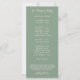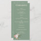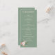 A chic and modern program card featuring rich sage green background accented by white roses & eucalyptus with blush, pink & peach floral elements.