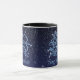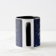 Mug featuring the zodiac symbol for Sagittarius in soft silver blue, overlaid with the stars of the constellation, against a starry sky background graded from deep midnight blue to black