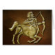Sagittarius zodiac greeting card rendered in gold against a rich gradient brown background.