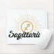 Zodiac themed design features gold starburst accented Sagittarius astrology symbol with black text.