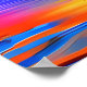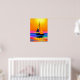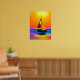 Poster in a vibrant sailboat with colourful sails glides across the water, reflecting the stunning hues of a radiant sunset. The sky and sea create a mesmerizing blend of orange, yellow, blue, and coral tones