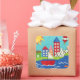 A cityscape serves as the background for a sailboat and a hot air balloon. A bright sun shines down on the scene, and a cute fish swims under the water. Purchase this peaceful print today!
