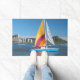 This door mat has a colourful sailboat pictured on it.