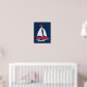 White and red sailboat on a blue background of tiled anchors. Nautical wall art for home.