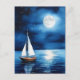 Postcard in an illustration of a sailboat drifting peacefully on a calm, moonlit sea, surrounded by a starry night sky. The full moon casts a gentle reflection on the water, creating a serene and tranquil scene.