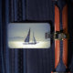 Sailboat off the Coast of California at Huntington Beach with the silhouette of Catalina island in the background.