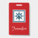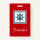 Nautical themed design with sailing scene decoration in striped squares on red background with name