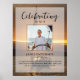 The perfect memorial poster for greeting family and friends as they enter your loved one's celebration of life. The design features a square personal photo, 5 lines of custom text and a background photo of sailboat and beautiful sunset. You can easily change this out with your own photo background. Classic yet unique - this template is so easy to personalize and will make a wonderful memorial keepsake too.