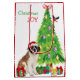On each side of this Holiday gift bag, a Saint Bernard Dog wears a red and white Santa hat while he sits beside a Holiday tree. Around the dog brightly wrapped gift packages are scattered about. A bullfinch is landing on the Christmas tree. The red and green text says "Christmas JOY".