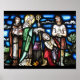 Vintage stained glass image of Saint Patrick with his followers bestowing a blessing on a man.
