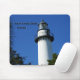 The lighthouse at Saint Simons is a working lighthouse and museum that is open to the public. Enjoy a photograph of the white lighthouse against a bright blue sky.