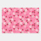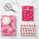 Un ensemble de trois feuilles d'emballage coordonnant moderne et fantaisiste, chacune avec un motif différent de la Saint Valentin douceurs sucrées : 1. Cookies de sucre glacé X et O avec fraises sur un arrière - plan rose barbie, 2. fraises couvertes de chocolat, de yaourt et de fraises sur un arrière - plan crème 3. sucettes en forme de coeur rose sur un arrière - plan rouge.