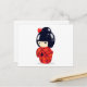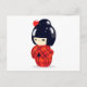 Cute oriental kokeshi doll in a dark cherry kimono dress with wide obi sash holding a yellow festival paper lantern. The girl's black hair is decorated with flowers and geisha style hairpins.