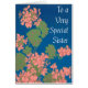 A pretty and versatile greeting card for a Sister, with salmon pink geraniums on a deep blue background, with white lettering, You can send this card for Mother's Day or for your Sister's birthday, or even as a 'Get Well' card. From a screen-printed design by Judy Adamson, you can personalize the inside message as appropriate.