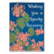 A pretty 'Get Well Soon' greeting card with salmon pink geraniums on a deep blue background, with white lettering, 'Wishing you a Speedy Recovery'. From a screen-printed design by Judy Adamson, please feel free to personalise the inside message.