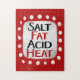 "Salt Fat Acid Heat" is a fun text design with a white accent shape surrounded by white whimsical textured dots.