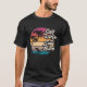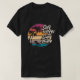 This black garment features a circular design with a tropical beach scene. Silhouetted palm trees and a beach chair are set against a striped sunset in shades of pink, orange, and yellow, above a blue ocean. The text "Salt Water and Sun Shine" is written in a casual script font. It evokes a relaxed beach vacation mood.