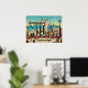 Célébrez la capitale de la mode italienne avec cette illustration rétro des années 1940 de style carte postale. "MILAN" apparaît en lettres majuscules pleines d'images miniatures du Duomo, de La Scala, du Château de Sforza et de la Galleria Vittorio Emanuele II. Derrière le texte, la cathédrale de Milan et ses rues animées sont peintes dans des couleurs vives et nostalgiques. Idéal pour les amateurs de design et de voyage.