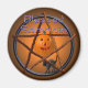 A pumpkin and a black cat perch on a reddish-orange chord pentacle to wish everyone a Happy Samhain.