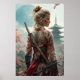 A powerful illustration of a female samurai warrior, traditional tattoos, standing under the full moon with cherry blossoms around. Strong composition inspired by Japanese culture.
