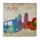 A neon watercolor outline of the San Diego city skyline with a distressed American flag backdrop.