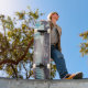 The image captures a low-angle view of two towering skyscrapers against a bright blue sky with fluffy white clouds. The building on the left is a reddish-brown color with large windows reflecting the sky and clouds. The building on the right is a sleek, modern glass structure with a curved facade.
