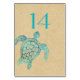Stylish beach themed wedding reception table number card done in a sand look with graphics of a turquoise blue decorative turtle. Personalize the turquoise blue number for each table at your reception.