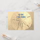 New address announcements with sand dollar image. Announce a new address on the coast with custom flat cards that have text templates on front and back. A realistic sand dollar on the front with dark blue, modern printed font. A view from the ocean toward homes on the beach is the background image for text on the back.
