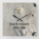 Beach sand wall clock to personalize with name or any text. Small, square size with white numbers and a sand dollar partially buried in the sand. A few other seashells are scattered around the edge of the clock. Text is dark gray. Hand color can be changed. Comes as round or square.
