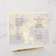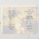 Sand dollars and palm trees folded wedding program template. Use four pages to customize this ceremony program for your tropical / beach themed marriage. One side contains a sunny tropical background image with tall palm trees. When folded, each side will become the front and back of the program. The reverse is light yellow with black text with lots of space for a long wedding ceremony. Include a thank you message beneath the "love is patient" scripture on the last page.