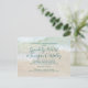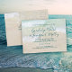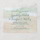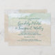 Two sand dollars, beach wedding invitation postcard to keep the planning simple and economical. All text goes on the front using templates with modern, handwritten script for names, and printed font style. Include reception info and wedding website as needed. Have guests reply online, and save money using this smaller postcard invitation - which needs less postage! Text is blue-green colour. Reverse is blank, with a wet beach background and two little sand dollars at the bottom. Hand-write addresses, or use address labels.