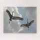 A photograph of beautiful Sandhill Cranes flying beneath billowing clouds.