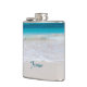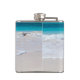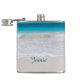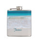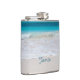 Beach themed drinking flask, with a photograph of a white sandy beach and aqua blue water. Personalize the blue text for yourself or as a great gift idea for your bridesmaids and groomsmen.