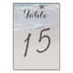 Carte numéro de table de plage de sable pour un mariage de plage. Scène tropicale derrière des nombres noirs, inclinés qui montrent de part et d'autre.
