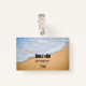 Name tag with a photograph of a golden brown sandy beach with white foamy surf.