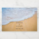 Wedding bottle labels with a photograph of a golden brown sandy beach with white foamy surf.