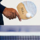 A ping pong paddle with a photograph of a golden brown sandy beach with white foamy surf.