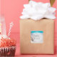 Thank you for your order business stickers with a gorgeous photograph. Tropical blue water and foamy surf in the background. A collection of seashells and stems set on a white sandy beach.