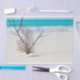 Tissue paper with a gorgeous photograph. Tropical blue water and foamy surf in the background. A collection of seashells and stems set on a white sandy beach.