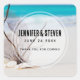 Wedding thank you stickers with a gorgeous photograph. Tropical blue water and foamy surf in the background. A collection of seashells and stems set on a white sandy beach.