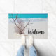 A welcome doormat with a gorgeous photograph. Tropical blue water and foamy surf in the background. A collection of seashells and stems set on a white sandy beach.