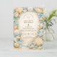 A refined coastal wedding design featuring an elegant oval wreath of seashells, oyster shells, starfish, and soft sea glass accents. Neutral sandy tones blend with muted ocean blues and delicate dune grasses to create a serene seaside aesthetic. The warm parchment background enhances the natural textures while maintaining a timeless, elevated feel. Perfect for a romantic beach celebration with classic coastal charm.