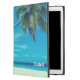 A personalized ipad case with a tropical themed photo featuring coconut palms stretching out across a secluded white sandy beach. Turquoise waters and an azure blue sky in the background.