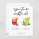 This chic signature cocktails menu features custom black typography above 2 drinks and their ingredients for your wedding bar. A cute summer Sangria and Mojito drawing add a cool flair to your bar menu. Complete with the couple's names and date for their reception.