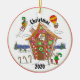 This Christmas ornament features a fun comic illustration of Santa Claus in a gingerbread house covered in colourful candy. Notice the elf on the rocket, another in a hot air balloon, one waving to Santa, and two more ice skating on a pond. Look closer and see Rudolph peeking around the corner of the house. The text reads 'Christmas' '2020'. You can change the year if you like. Original artwork. Copyright Leah Wiedemer.
