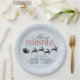 Festive Christmas paper plates. A subtle grey background with snowflakes. Fancy trendy lettering which says: Merry Christmas and Happy New Year. With a black silhouette Santa riding in his sleigh being pulled by his reindeer flying across the sky.