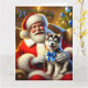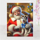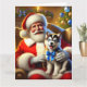 An adorable Christmas scene with Santa Claus and a cute Husky puppy with a blue bow sitting beside a Christmas tree. It includes an original funny Christmas message that dog lovers are sure to love.