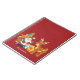 A cute illustration with the holiday spirit. Santa Claus carrying his gift sack and waving hello. His reindeer friend by his side, hanging out by a decorated Christmas tree, with presents all around. Set on a red background with whimsical circles. Festive and cheerful design. Personalize with a name or other custom text.
