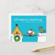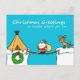 A sweet Christmas postcard with blue and snow background. It comes with a cute cartoon of Santa and reindeer attempting to deliver presents to a tent by crossing a wooden bridge. The message reads "Christmas Greetings no matter where you are". The postcard is suitable for your loved ones or friends who are currently staying far away and you wish to let them know you think of them at Christmas no matter the distance apart.